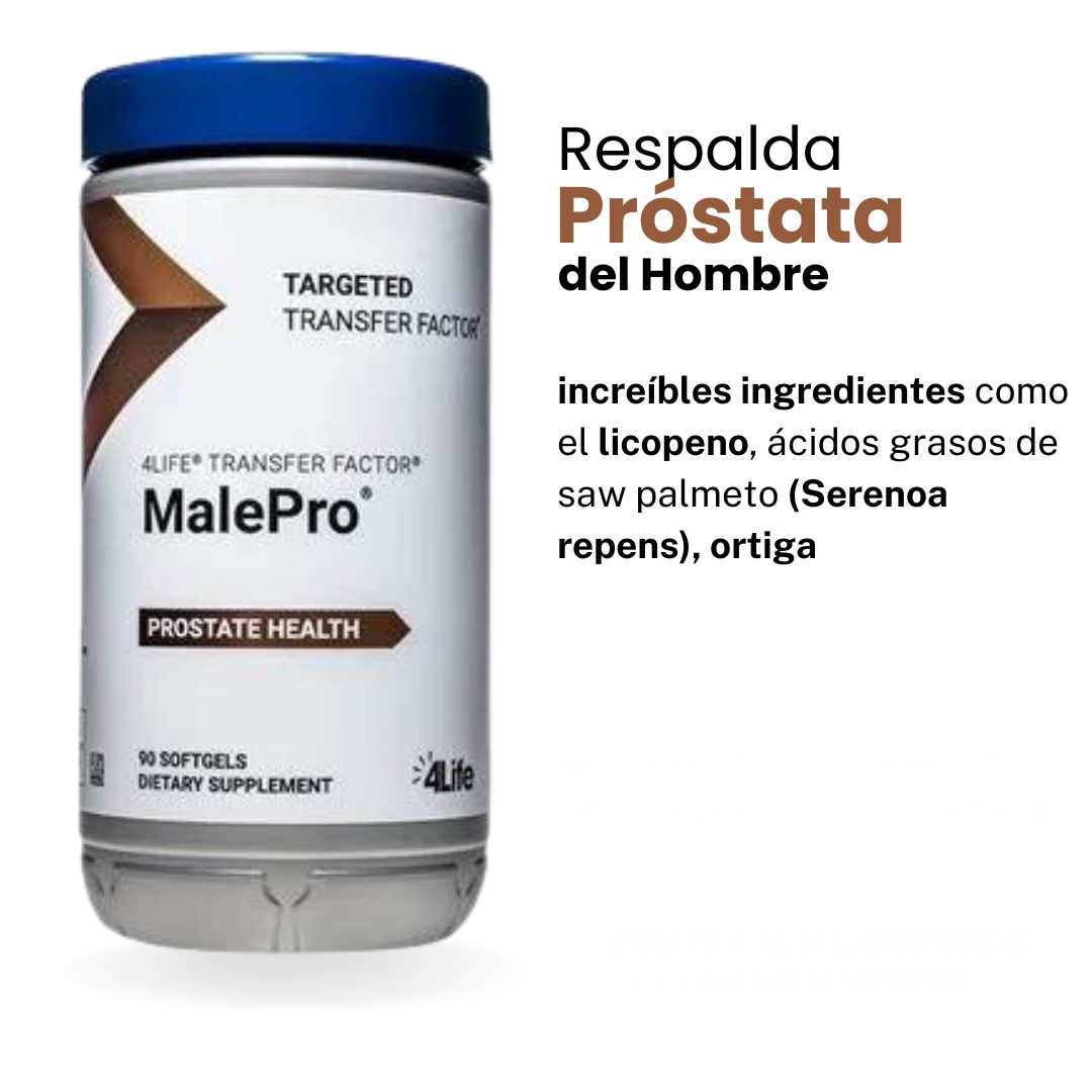4Life Transfer Factor MalePro está formulado específicamente para ofrecer múltiples beneficios clave para la salud del hombre. Uno de los principales beneficios es el apoyo a la salud de la próstata. Según estudios científicos, componentes como el Extracto de Serenoa repens pueden contribuir a mantener una próstata sana y reducir síntomas asociados con la hiperplasia prostática benigna.