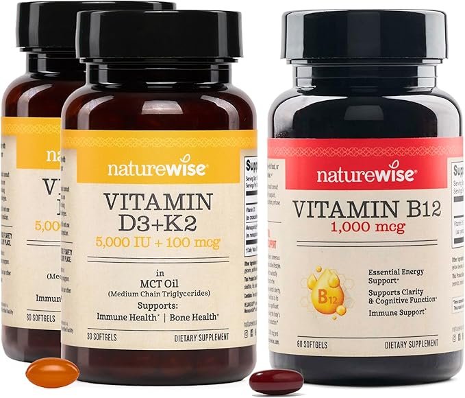 NatureWise Paquete de 2 vitaminas veganas D3 5000IU + K2 – Aceite orgánico de coco MCT – 30 cápsulas blandas [suministro de 30 días] + [1] Vitamina B12 1000 mcg – Sin gluten, sin OMG – 60 cápsulas