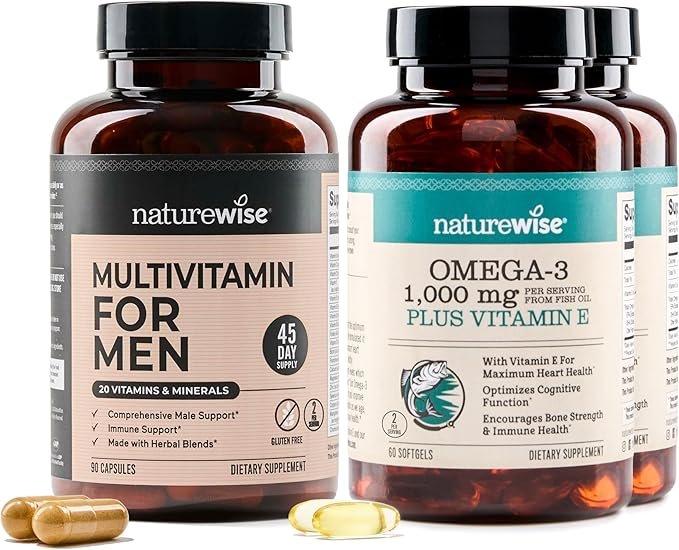 NatureWise [1] Multivitamínico para hombres, sin OMG, 90 cápsulas [suministro para 45 días] + (paquete de 2) aceite de pescado Omega 3 de 1000 mg + vitamina E, capturado en la naturaleza, 60 cápsulas